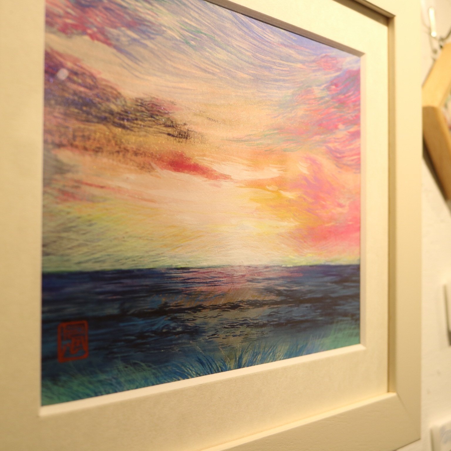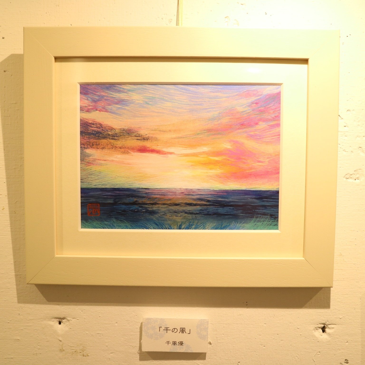 なぜ夕方なのか?その時閉園間近だったというエピソードをお聞きしました(^ ^)金魚の作品も、金魚とアートの展示を見に行って、「金魚が息苦しそうだったから、伸び伸び泳いでいるところを描きたいと思ったそうです。